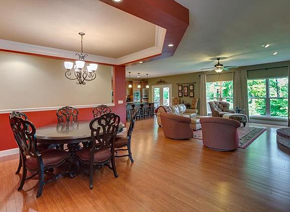 Gorgeous ranch home with 4 bed, 3 baths, featuring stone & brick elevation w/ professional landscaping. Custom upgrades include hardwood flooring throughout the main floor, beautiful granite counter tops, 2 pantries, Electrolux stainless steel appliances, 2 wine coolers and an over sized center island. Other main floor features include open floor plan, separate kitchen and formal dining rm, beautiful crown molding, main floor laundry rm/mud rm, and a masonry gas fireplace. Master bedroom features dbl vanities, jet tub and shower, and great walk-in closet. 2 additional bedrooms and full bath upstairs. The professionally finished walk out lower level features a kitchenette, rec/game rm complete w/ wood burning fire place, additional full bath, bedroom, and a work out rm. 2 different unfinished storage areas. Partially covered deck is perfect for grilling and relaxing. 3 car garage means ample parking for everyone. Just minutes from shopping, dining, and the interstate.