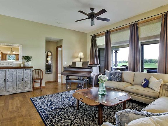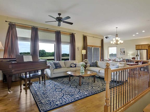 Sand Creek Station STUNNER! Former model home on the 18th fairway with sweeping views from the tee box to the green. Nice water view of the pond. The backyard is an entertaining oasis! Spacious covered composite deck, walk out basement, covered patio area from basement bar, outside patio with built in fire pit, gorgeous yard with wrought iron fence, sprinkler and well. The interior is a perfect open plan with several seating areas allowing for the perfect flow in both large group settings or just a quiet evening at home. All of the extras here! Wood floors, tile entries, granite counter tops in kitchen and baths, walk in pantry, islands, bulit ins, and more. Awesome hearth room off the kitchen complete with stone fireplace. Floor to ceiling windows capture the most perfect sunsets! Master suite is just as you would suspect. Large over sized shower, corner tub, double sinks, walk in closet with seasonal storage, coffered ceilings and VIEWS! Full finished basement includes family/rec room with fireplace, game room area, very nice wet bar (full kitchen), 2 bedrooms and full bath. One of Newton's most desired neighborhoods. Enjoy walking paths and private community pool. Easy access to highway.