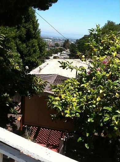 Belmont Hillside Home with View of Bay and Hills. Sloping but usable backyard.