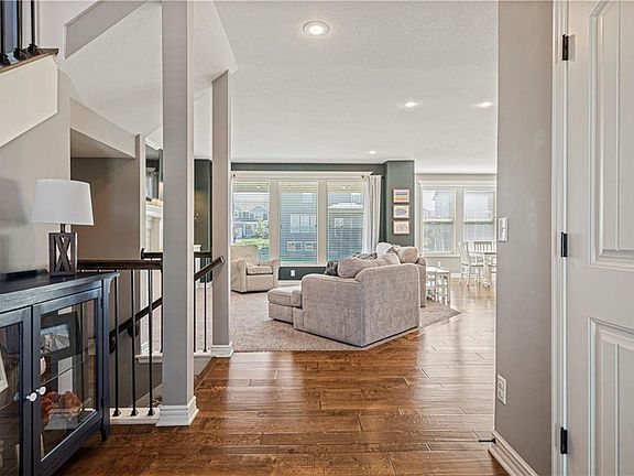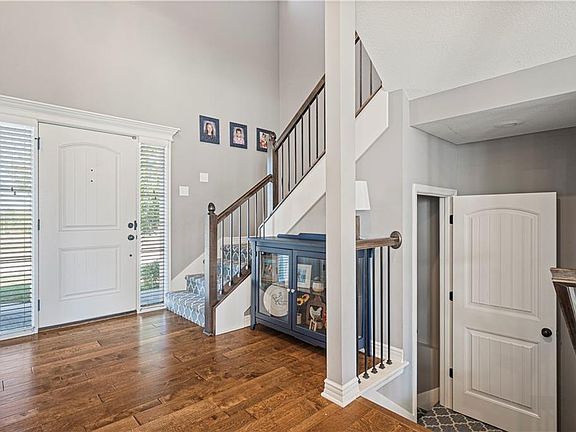 Gorgeous Palmer by Summit has been upgraded! Welcoming front porch greets you, opens to 2 story entry with large closet. Wide staircase to left has 2 landings, large window bringing beautiful natural light, wood floor & 18' ceiling. Wood floor continues through to kitchen & dining. Dining has wall of windows, custom built-in with glass front upper cabinets & extra storage below. Kitchen has 9x4 walk-in pantry, 8' long center island, wall of cabinets with lower having large drawers for max storage. White cabinets, granite counters. Great room with updated tile at fireplace, wall of windows overlooking backyard. Mud room off kitchen, on way to garage, has tons of storage with boot bench, cubbies & hooks. 1/2 bath as well. 2nd floor has primary suite with HUGE walk-in closet, built-in full length mirror & private bath has long dbl vanity with large drawer stack in center, granite counters, large tiled shower. 2 of the 3 additional bedrooms have walk-in closets! All bedrooms have ceiling fans. Large laundry on bedroom level has folding counter w/cabinet above, shelves & long rod for hanging above w/d location, tile floor. Lower level finish has 9' ceilings, large family room has carpet, granite topped wet bar w/ floating shelves & tile floor. Large area for TV w/ 2nd TV hook up over bar. 5th bedroom has 11' long closet along 1 wall. Full bath has tiled shower. Storage is still abundant, with large closet, under stair storage & unfinished space. Outside, off dining room, a 10x17 covered patio has ceiling fan, rolldown shade on west end. Expanded open patio is 5' along the covered patio & large 10x16 patio along back of home. Level lawn is fenced. Landscape front & back has beds lined with limestone. Level driveway, Garage is 31'wide & 21'deep, 11' ceiling height, great for additional storage space. Home is just down from the community pool with no home directly across the street. Great value in Lee's Summit!