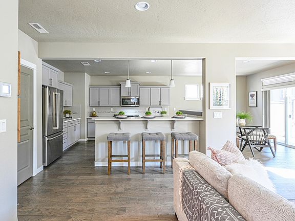 Open floor plan features a spacious, attractive kitchen with ample counter space. Solid Quartz counter tops, 6 burner gas range, stainless steel appliances and under cabinet lighting. Engineered hardwood floors & gas fireplace to keep you cozy on winter days. Primary bedroom with vaulted ceilings, is large enough to comfortably fit a California King bed. Nice walk-in closet. En-suite bathroom offers a dual vanity, soaking tub and tiled shower. 4th bedroom could also double as an office. Convenient upstairs laundry with cabinets and utility sink. Enjoy the covered patio, fenced yard with low maintenance landscaping. Large insulated garage and door to the back yard. Lots of options for storage. Family friendly neighborhood with easy access to several parks, shopping & the hospital. No HOA. Home Energy Score a 10! Oversized solar system.