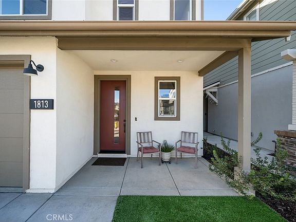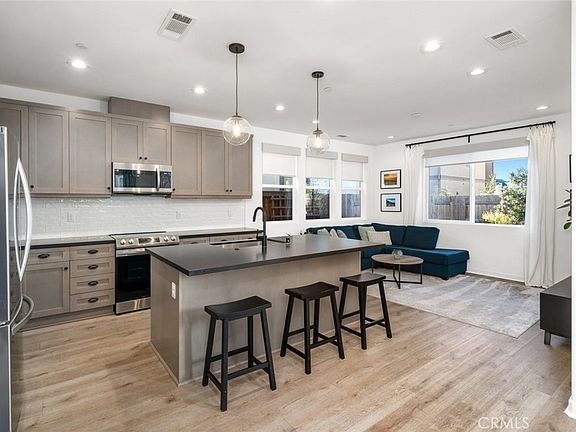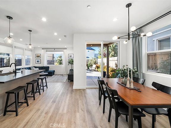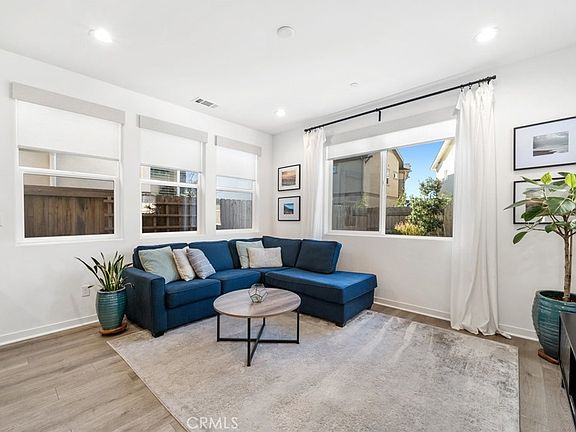 Set on a premium lot, this double sized backyard is ready to enjoy with views looking up to serene Eucalyptus trees and features low maintenance turf, lush foliage with automatic irrigation and large paved patio for outdoor entertaining. Inside, the open floor plan is perfect for entertaining or everyday living. The thoughtfully designed kitchen features a sleek layout with ample counter space. The living room, adorned with cordless roller shades, is a comfortable retreat filled with natural light.