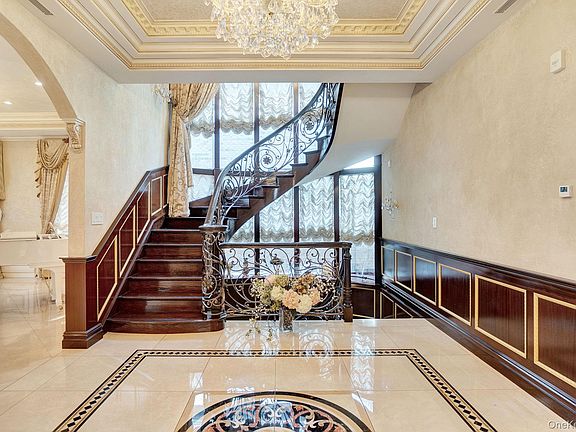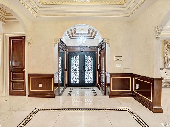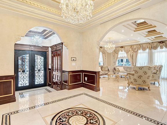 A dramatic foyer welcomes you with intricate porcelain mosaic flooring, soaring ceilings, and crystal chandeliers. Rich mahogany paneling, detailed custom moldings, and a sweeping wrought-iron staircase set an unmistakably elegant tone throughout the home.
