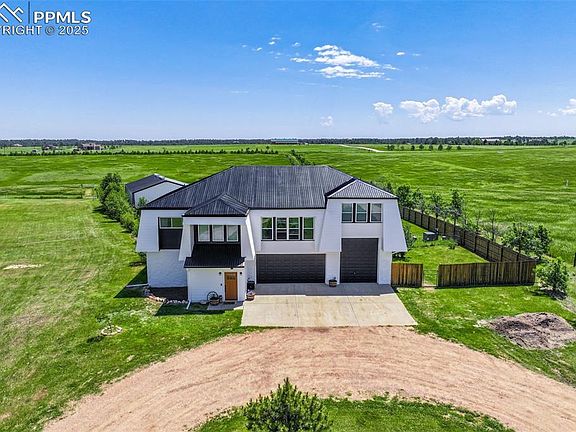 At the very end of a quiet private road, you’ll find a Colorado retreat that actually feels like one. Thirty-five acres of rolling, tree-studded landscape, wide-open skies, and complete privacy wrap around this modern farmhouse,creating the kind of lifestyle people imagine when they think of living in the country. Step inside and you're greeted with over 3,500 sq ft of thoughtfully crafted space. Real hardwood floors,custom railings, triple-pane windows, and 9-ft ceilings set the tone. The kitchen is the heart of the home with a massive island that seats eight, a gas range, and storage for days. It flows straight into a dining room framed by picture-perfect views, and the living room is anchored by a gorgeous stone fireplace with built-ins. The primary suite feels like its own getaway, tucked up a private staircase with oversized windows, a spa-inspired bath, and a generous walk-in closet. The lower level offers a theater room,another bedroom and full bath, plus a flexible living space ideal for guests, multigenerational living, or a private workspace. Car lovers, hobbyists, and entertainers will love the heated 1,500 sq ft attached garage it can fit up to six vehicles tandem or four plus a full-size RV, complete with hookups, clean-outs, water access, and room to gather. The 2,300 sq ft shop adds even more: fully insulated,heated, concrete floors, water, and 400-amp service. The property itself is a dream.Six fenced and cross-fenced pastures, healthy hay grass, over 2,000 mature trees and lilacs, plus rolling terrain that makes every sunset feel cinematic.A custom chicken coop and a privacy-fenced backyard round out the perfect country setup. You’re minutes from Homestead Ranch Regional Park and within a quick drive to schools and Falcon. Modern conveniences are already in place: 2-gig fiber internet, two water heaters,A/C, a water softener/filtration system, and a newer furnace. No matter where you stand inside or out the views are nothing short of incredible.
