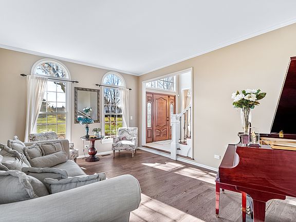 This sophisticated, four bedroom three and a half bath residence is nestled on quite street with towering mature trees, you are embraced with elegance upon entering the estate, soaring ceilings, gleaming red oak hardwood floors and these are just your views as you enter the home, grand two story foyer brings in remarkable natural light, the sensational open floor plan is perfect for entertaining guests, sophisticated decor with an emphasis on timeless elegance, marvelous gourmet kitchen with shockingly large island, granite counter tops with abundant cabinet and counter space, which boasts incredible palladian windows with newer custom window treatments, a gorgeous neutral brick surround fireplace and creamy white wood detailing. cabinetry, smooth granite countertops, premium nickel hardware, high-end stainless steel appliances, a butler pantry with a convenient second sink and a pass through overlooking the family room area. second floor boasts four large bedrooms and ample closet space, luxurious master suite with enormous walk in closet and private glamour bathroom, the full hallway bath also has luxe upgrades including a gleaming onyx vanity, contemporary cabinetry and upscale lighting. Gather within the expansive lower level light-filled recreation room with plush carpeting and crisp neutral paint; this space is just perfect for entertaining, installed new real hardwood floors in the office and and dining room, The lower level also features another full bathroom, installed new LVP throughout the entire basement, new Kohler comfort height toilets installed in all bathrooms, all new designer light fixtures, new vanity with marble top and higher end Kohler fixtures installed in master bath and first floor powder room, LED ceiling can throughout the kitchen, custom painted cabinetry in pantry and coffee bar kitchen, LED kichler lighting in office, Schoenbeck crystal chandeliers in foyer, kitchenette and dining room, Decora switches and outlets first and second floor, brand new insulated garage doors with professional genie garage doors and openers in all bays, custom shelving installed for shoes in garage, garage floor epoxied, and sealed 2023 and all walls painted, Hinkley luxury lighting installed exterior of home, new electrolux front load washer and dryer with pedestals substantially sized wet bar, separate laundry room with utilities, and the two large closets provide all of the storage you could ever need. The Mill Creek Crossing community in Gurnee offers direct access and is just steps from private HOA owned trails, a cross country ski loop and pond incredibly private backyard, professional landscaped grounds, quarter acre lush green lot in the peaceful, . and just beyond the backyard is Mill Creek and nothing but a quiet wooded area, newly refinished patio and serene wooded view of the sprawling backyard just steps away from Mill Creek. This marvelous location is within close proximity to shopping, fantastic dining options, I-94 and nearby theme parks. Excellent top-rated school districts 50 & 121 featuring Warren Township High School