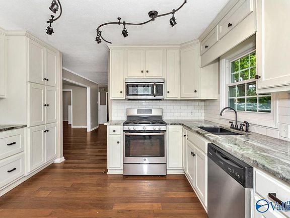 Move-in ready. Updated 4 bedroom ranch with study 200 feet from the elementary school and 500 feet from the neighborhood pool. Corner lot with fenced in backyard. All wood or tile floors. Neutral colors. 2 of the 3 bathrooms completely remodeled. Kitchen remodeled with custom cabinets, marble counters, subway tile backsplash and stainless appliances. Gas range. Oversized 2 car side entry garage. Located less than 15 minutes to Redstone Arsenal and Research Park. Sold "as-is".