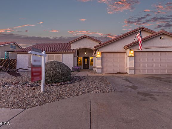Exquisite 4-bed, 2-bath home featuring a 2-car garage and RV gate offers a perfect blend of style & functionality. Greet guests in the welcoming living room & entertain effortlessly in the great room bathed in natural light, boasting a neutral palette & tile flooring. The kitchen showcases granite counters, ample cabinets with crown moulding, SS appliances, tile backsplash, and a two-tier island with a breakfast bar. Withdraw to the main bedroom, offering backyard access and a full ensuite with dual sinks. Enjoy breathtaking sunsets in the backyard, showcasing a full-length covered patio, lush natural turf, a built-in BBQ, a relaxing above-ground spa, and a stunning pool with a fun slide and a waterfall grotto, providing the perfect backdrop for memorable gatherings. No HOA! Hurry to see