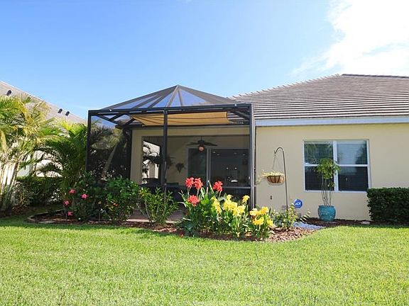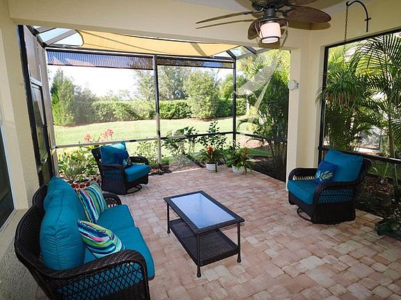 GATED COMMUNITY- Enjoy the open flowing floor plan of this 2 bedrooms, 2 bath plus den "MAINTENANCE FREE" home. It is in excellent condition and has been well-appointed with substantial upgrades when compared to new construction: you will quickly realize the value. Some of the upgrades include crown molding, wood flooring in master suite and den, bead board under the breakfast bar, and an amazing custom built banquette. No need to purchase ceiling fans or worry about window treatments or pendant lighting, this property has it already. There is a fantastic extended lanai to enjoy the cool breezes of Florida that is equipped with sun saver shades and a sun sail canopy for your convenience. Eagle Trace is a community that has two dog parks, community pool with an outdoor kitchen for residences along with tennis courts. You'll love what it has to offer and the location is ideal.