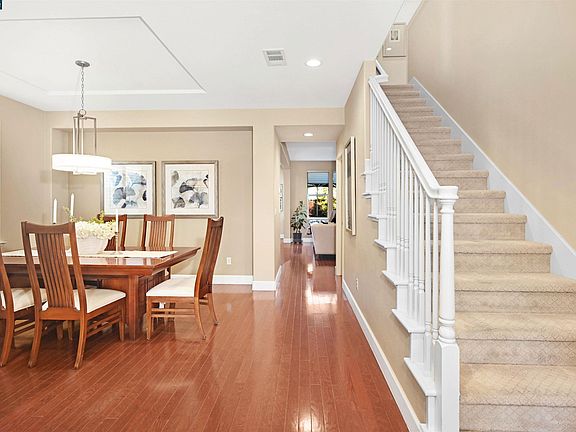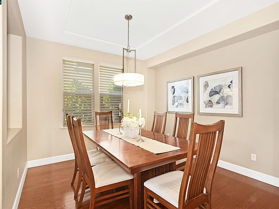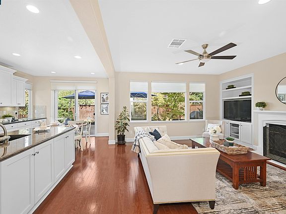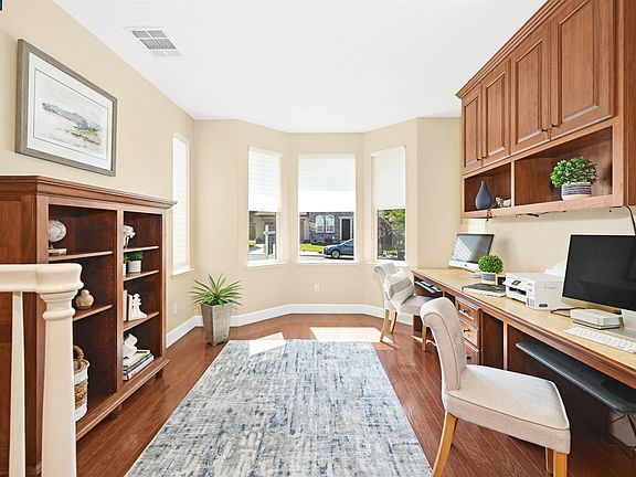 Located conveniently close to Creekside Elementary and Diablo Vista Middle School, this beautiful Monterosso home has 3 large bedrooms, 2 ½ baths and a large upstairs bonus room that possibly can be converted to a bedroom. The large primary suite with raised ceiling, two walk in closets with custom organizers. The primary bath has tile counters, soaking tub with stone surround and tile and stone stall shower. The first floor has wood flooring and an office suite that possibly could be converted into a bedroom. There is a dining room with decorative chandelier. The updated kitchen has granite counters, decorative tile backsplash, white cabinets, five burner gas stovetop and newer appliances (approx. 2018). This large updated kitchen opens into a large family room with built in custom bookshelves and cabinets and a gas fireplace. The breakfast nook looks out to the rear yard. Large upstairs laundry room with lots of cabinets and solid surface counters. Ceiling fans in select rooms. The large rear yard has a patio and grass area. The attached two car garage has a tandem space for another vehicle or workshop/ storage. Conveniently located near shopping, restaurants and top-rated schools.