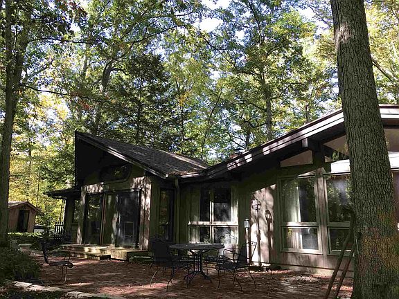 One of a kind! Open California style 3 BR 2.5 BA ranch setting on almost one acre of woods on the top of the hill. Private and scenic. Enjoy large foyer, living room, dining/family room, walk out basement. Grabill cabinetry, hardwood floors in much and tile/carpet elsewhere. plaster and solid beam construction. 3 year old furnace/AC serves most of house, electric ceiling heat elsewhere. Large 2 car garage. Stained glass and doors from the old St. Vincent church. Unique home! Additional shower in lower level.