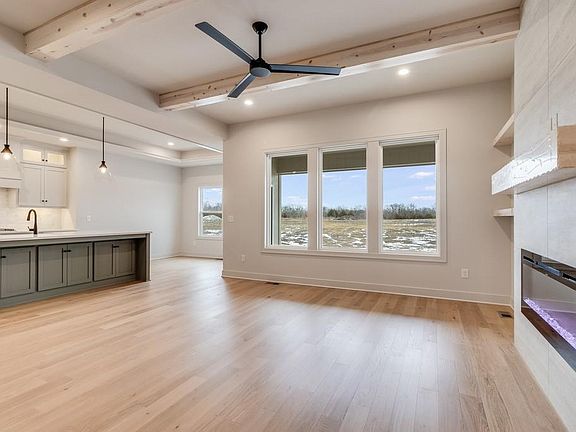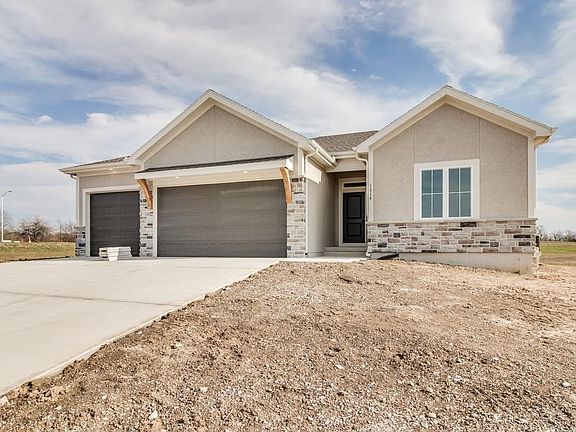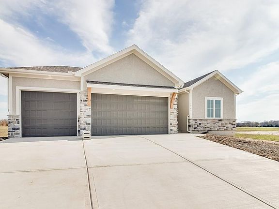 This is the Osceola II by Titan Custom Homes. This stunning new home perfectly blends modern comfort with a warm country feel. The great room boasts soaring ceilings, tall windows, and a cozy fireplace, creating a welcoming ambiance. The kitchen features a large island, quartz counters, and a walk-in pantry. The master suite includes a spacious bedroom, double vanities, a walk-in tiled shower, and a large walk-in closet that connects to the laundry room for ultimate convenience. The finished basement offers a rec room, 2 additional bedrooms, a full bath, and ample storage space. The neighborhood has a picturesque fishing pond and a scenic walking trail offering residents a serene environment for relaxation and recreation. Raymore is conveniently located just south of Kansas City, providing easy access to the metropolitan area while maintaining a small-town feel. There are a variety of shopping and dining options, from local boutiques and restaurants to larger retail centers and popular chain eateries. Welcome home!