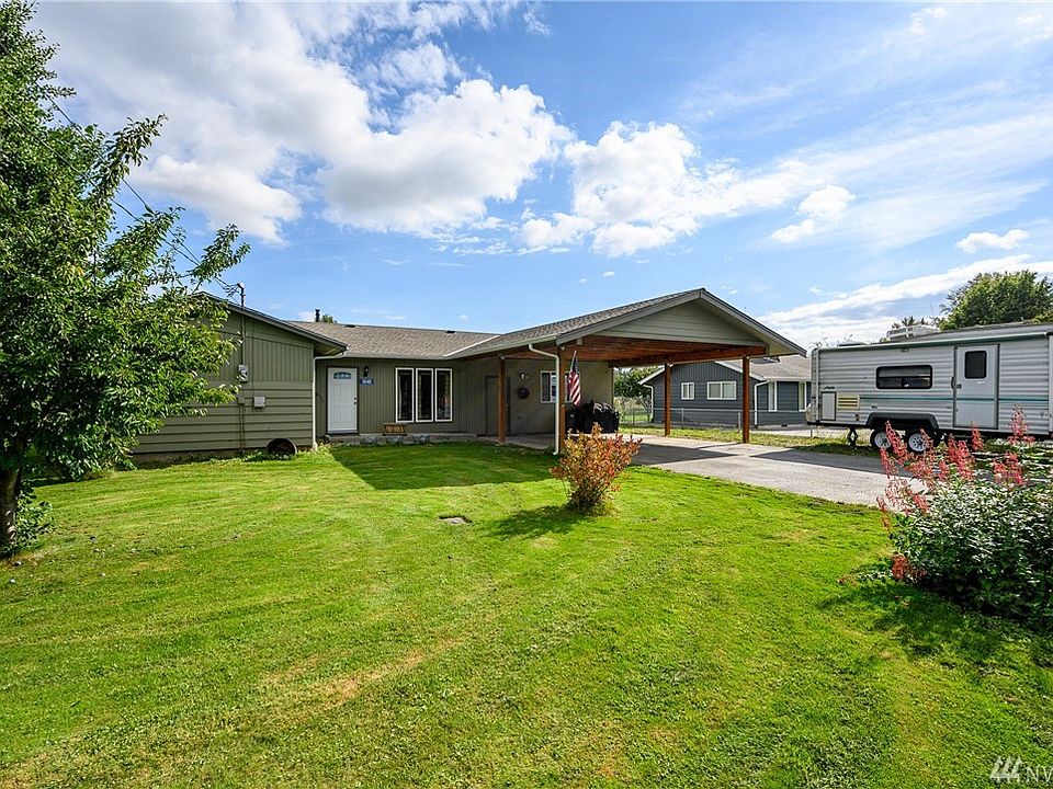 Updated mid-century classic in quiet neighborhood. New cabinets, tile backsplash and solid surface countertops in kitchen. Vaulted ceilings with exposed beams. Large living/family room with gas stove. New laminate flooring in kitchen and dining room. Updated double-pane vinyl windows throughout. Large fully-fenced backyard with views of the Cascades and Skagit Farmland. Plenty of room for your RV. Close to amenities but feels like country living.