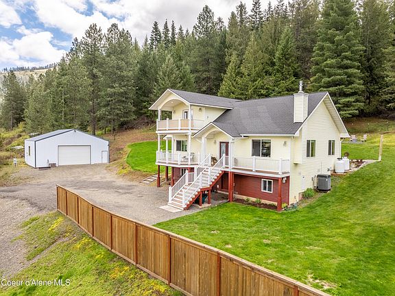 Escape to your tranquil retreat just 35 minutes from Coeur d'Alene! This inviting 3 bed, 2 bath home offers comfort and style, with breathtaking views of the Coeur d'Alene River. Inside, vaulted ceilings and abundant natural light create a warm, inviting atmosphere. The spacious kitchen features stainless steel appliances, a pantry, and plenty of counter space. Wind down in the huge master suite with a jetted tub, and custom tile shower. Outside, a 30x36 detached garage/shop is perfect for storing all your toys and tools. Relax on the private back patio with a saltwater hot tub. Situated on almost half an acre among trees, enjoy peace and privacy. For outdoor enthusiasts, this home is 30 minutes from ski hills, 10 minutes to the boat launch, 5 minutes to the trailhead. With new carpet, paint, gutters, and blinds, this home is move-in ready.