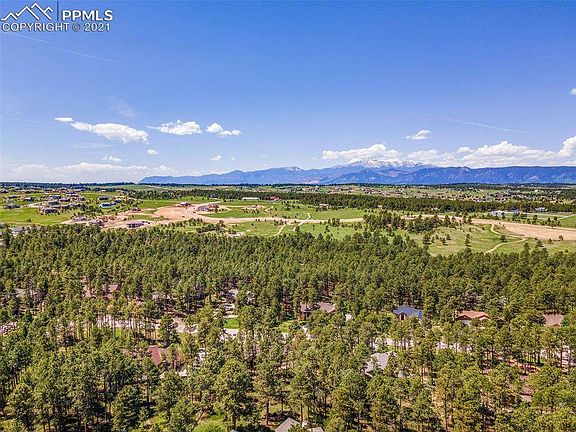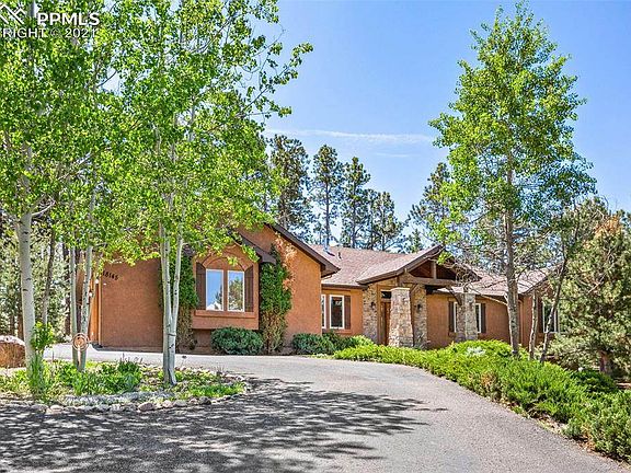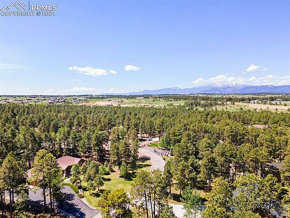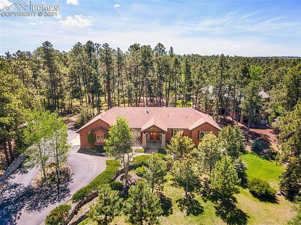 Spectacular Custom home nestle in the Pines of Walden III on a .67 acre lot! This sprawling ranch style homes offers custom features throughout! The Covered beamed entry opens to hardwood floors flowing to the great room with vaulted ceilings, Fireplace w floor-to-ceiling stone surround & a beautiful wall of windows boasting towering pines. Views of the landscape are captured from the eat-in kitchen w breakfast bar. Gourmet kitchen offers Stainless steel appliances, granite counters, knotty alder cabinets, pantry & gas range. Adjacent to the kitchen is the formal dining room with coffered ceiling, chair rail & decorative alder inlay. Main level master suite offers a walk-in closet, sitting area, spa-like 5-pc bath with walk in shower & jacuzzi soaking tub. Additional main level features include an office w/French doors that can double as a bedroom and a huge mud room off of the garage with a 2nd staircase to access the basement and workshop! The Curved wood stairway leads down to the walk-out basement which boasts an open family room w/gas fireplace, stone accents, wet bar w/ knotty alder cabinets, mini fridge & rec room. 3 large bedrooms that have walk-in closets & share 2 full bathrooms. The basement also includes a large media room and workshop with exterior access which also allows for storage of motorcycles, ATV's or side by sides. Additional amenities include covered and heated gutters, composite deck, paved driveway, new split rail fence, central A/C, Solid core knotty alder doors, crown molding, oversized/tall 3 car garage that will fit a full size truck w/ 8ft bed! Conveniently located near I-25 and Hwy 83 makes for an easy commute to Denver or Co Springs. Neighborhood features include an elementary and High School, private walking trails, ponds and stunning views of the Front Range!