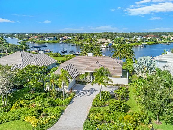 Breathtaking, wide river views of this highly-desired pool home on elevated lot in the exclusive gated community of River Ridge! Single-story 4 bedroom, 3.5 bath, 2.5 car garage has an open split floor plan with private entry guest suite, vaulted ceilings, porcelain tile throughout, fireplace with custom coral mantel frame, large covered patio & lots of storage spaces. This hurricane proof home has impact glass windows, button-controlled roll down shutters, new impact garage door & skylights, & tiled roof (2005). Remodeled in 2010, the kitchen features custom soft-close wood cabinetry, granite counters, & black appliances. Newer composite dock with 9500 lb boat lift for up to 30' boat with water/electric. Minutes from everything in Palm Beach County with lower taxes in Martin County!