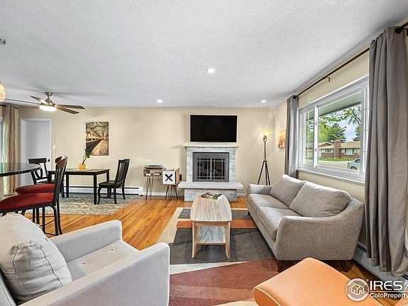 Happy Dwelling! This adorable ranch-style home is exactly what you've been looking for in Longmont! Well-maintained and situated on a private, quiet street with mature trees, this home is located just a short distance from downtown. A bright and open floor plan welcomes you here! You'll love the wood floors, cozy brick fireplace, and thoughtful updates made throughout this home. The remodeled kitchen features gorgeous wood cabinets, sleek granite countertops, and stainless steel appliances. The breakfast bar provides convenience and additional counter space, opening to the dining room with easy access to the back patio. One-level living at its finest...all three bedrooms and two updated baths are easily accessible and allow easy flow throughout this home. Outside, enjoy the spacious covered patio, which is great for entertaining. A generous fenced-in yard with raised beds and plenty of room to play is the perfect place to soak up the Colorado sunshine with friends and family.