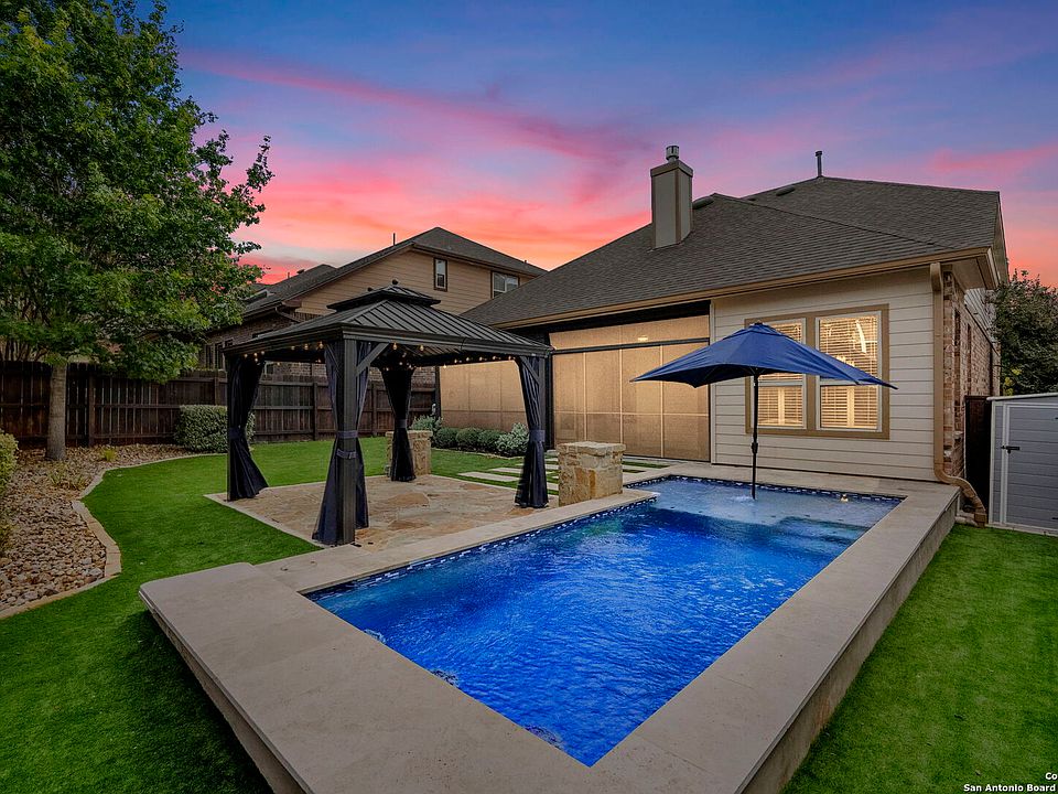 Welcome to this stunning former Ashton Woods model home in San Antonio's sought-after Arcadia Ridge community. Designed for luxurious living, this meticulously maintained 4-bedroom, 3.5-bath home boasts nearly 3,000 square feet of top-quality finishes and upgrades. As you step inside, you're greeted by beautiful hardwood floors that stretch throughout the main level, adding warmth and elegance to every room. Upstairs, newly installed luxury vinyl plank (LVP) flooring continues the carpet-free design, ensuring a clean, modern look throughout. Each detail, from custom tile work to designer light fixtures and shiplap accents, reflects the attention to quality that defines this home. The open-concept kitchen and living area create an inviting space for entertaining, with large windows allowing natural light to fill the room. The kitchen is a chef's dream, equipped with premium appliances, sleek cabinetry, and a spacious island perfect for gatherings. Upstairs, the bedrooms offer generous space, privacy, and style. The primary suite is a retreat, featuring a spa-like en-suite bath with custom tile work and ample closet space. Three additional bedrooms provide comfort and flexibility for family, guests, or home office needs. Step outside to the backyard, an oasis designed for relaxation and fun. Enjoy the screened-in porch, a tranquil space for morning coffee or evening relaxation. The backyard also features a sparkling pool and a charming gazebo, creating the perfect setting for outdoor entertainment. Located within the highly regarded Northside ISD, this home offers both convenience and quality. With its prime location, superior finishes, and luxurious amenities, this Arcadia Ridge gem truly stands out. Don't miss the opportunity to make this remarkable home yours!