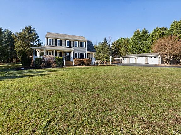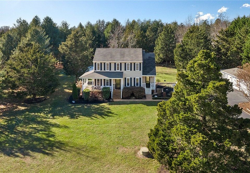 Two acres in Powhatan! This adorable, private home is close in to town and boasts a wrap around porch, three car detached garage with an office/workshop and beautiful landscaping. Inside find updated flooring throughout, kitchen with granite countertops and stainless steel appliances, breakfast nook with skylight, a large dining room and a living room with a stone gas fireplace. Upstairs is the primary bedroom with an ensuite bathroom and huge walk in closet, two more good sized bedrooms and a hall bathroom. Convenient location with quiet country living!