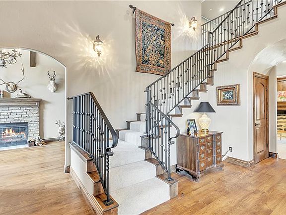 This stunning home offers a perfect blend of modern elegance and comfort, making it a true gem in gated Edinborough Pointe. As you step inside, you'll be greeted by a grand foyer adorned with beautiful hardwood floors. The study has a fireplace with built-in shelving and cabinetry with windows to the front of the home. The open concept layout seamlessly connects the main living areas, where the fireplace creates a warm and inviting atmosphere for entertaining guests or spending quality time with family. The spacious gourmet kitchen is a chef's dream, featuring top-of-the-line stainless steel appliances, double ovens, custom knotty alder cabinetry, and a center island with a gas cooktop. The primary suite offers a spacious bedroom, a walk-in closet, and bathroom complete with a jetted tub, separate shower, and dual vanities. Three additional bedrooms and two well-appointed bathrooms upstairs as well as a loft living area provides ample space for family and guests. Step outside to discover a private oasis in the backyard. The covered patio is perfect for outdoor dining or simply enjoying a morning cup of coffee while overlooking the backyard and vegetable garden. Additional features include solid core doors throughout, oversized three-car garage, storm shelter, full sprinkler system, water softener, laundry room with sink and rack hanging, and a massive amount of decked walk out storage in the attic.