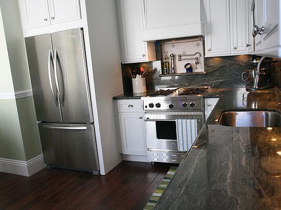 Waterfall faucetBay and downtown viewsHans grohe fixturesItalian carrera marbleGorgeous period piecesProfessional stainless steel appliancesGranite countertops