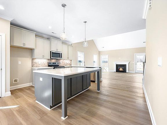 The Windsor Homes Richmond plan boasts a host of exceptional features, highlighted by an open floor plan on the main level. The dining room is elegantly finished with a coffered ceiling, adding a touch of sophistication. The kitchen is designed for both style and functionality, with 42'' cabinets, stainless steel appliances, and a spacious island with bar seating, as well as an additional bar seating area that connects seamlessly to the great room. The great room itself is a striking space, featuring a vaulted ceiling and a cozy fireplace, creating an inviting atmosphere for relaxation and entertainment. The primary bedroom, located on the main floor, offers recessed lighting for a soft, ambient glow. The en-suite bath is complete with dual vanity, a 5' tile shower, a separate commode room, and a generous walk-in closet. Upstairs, the second floor is home to 3 spacious bedrooms. A versatile loft area overlooks the great room below, providing an ideal space for a home office, playroom, or reading nook. This thoughtfully designed layout combines comfort, convenience, and style in every corner of the home.