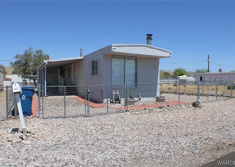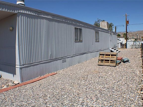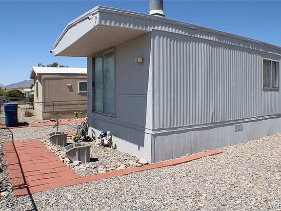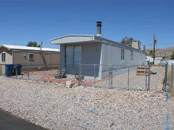 Cozy 2 bedroom home with an open living and kitchen area with casual dining. Enjoy this wood burning fireplace in smaller living area or what could be a sitting area. Refrigerator, dishwasher, stove, water heater, furnace, vinyl plank flooring, tile flooring in bathroom, skirting around mobile, backdoor & roof re-sealed are all 3 yrs old. Jack & Jill bathroom with walk-in shower, which connects the master room & hallway. Master bedroom includes his & hers closets. Detached workshop/storage with shelving. Side RV parking with a 220 amp. Mountain views from east side of property, close to local shopping, schools. Minutes to the Colorado River, Laughlin, NV & Lake Mohave. Buyer to verify sq.ft., floodplain and utilities.