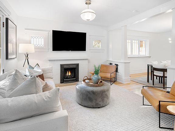 The main level offers an open-concept living space with a sun-filled living room, a stylish dining area, and a modern, updated kitchen with exposed brick and contemporary finishes. A cozy fireplace, chic half-bath, and mudroom add extra comfort and convenience.