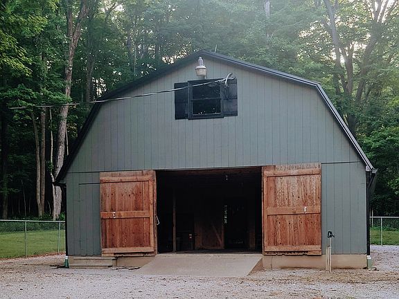 Step into this gorgeous retreat that blends modern upgrades with classic mid-century architecture. Nestled along Big Walnut Creek & an 1880's covered bridge, the property features a charming two-story barn surrounded by woods, creating a serene backdrop. Convenience of high speed internet make working remotely from this tranquil oasis a breeze. 2 miles from downtown Greencastle this idyllic property offers a perfect balance of modern amenities & nature. Tastefully renovated with high-quality improvements. Roof, windows, siding, gutters & HVAC system have all been updated with energy-efficient features. Freshly painted, luxury vinyl tile, new carpet and oak hardwood floors. In addition recessed lighting & custom light fixtures have been added throughout. As you step inside the home you will notice the abundance of natural light filling every room. Thoughtfully designed windows offer stunning views of the historic covered bridge & the wooded surroundings. The gourmet kitchen offers custom Amish cabinets soft close doors & beautiful quartz countertops. New stainless Bosch appliances & 2 large pantries make this kitchen a culinary dream. The dining area flows effortlessly into the spacious living room making entertaining a breeze Main bathroom offers custom tile shower/ soaking bath combo, custom vanity w/ granite top & double sinks. The unique hallway guides you to the master bedroom which boasts beautiful hardwood floors & spacious sitting area. Additionally two generous bedrooms with hardwood floors round out the main floor Walking down the stunning wood staircase you will be greeted by a full daylight walkout basement. The lower level features 2 spacious bedrooms, full bath, living & great room & large laundry/hobby room. There is an attached 6-car tandem garage that is split into a 2-car garage & heated/ cooled, ventilated flex area w/hot & cold water & washer/dryer hookups. Plus a 30x40 two-story barn complete with a concrete floor water & electricity.