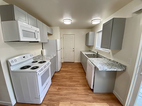 AVAILABLE JUNE 1ST! This home was recently completely remodeled! New vinyl flooring, remodeled kitchen with new appliances and remodeled bathrooms. 4 Large bedrooms with 3 full baths. Huge fenced back yard with an apple tree and patio. Wood burning fireplace. Laundry hook ups available. 2 car garage.