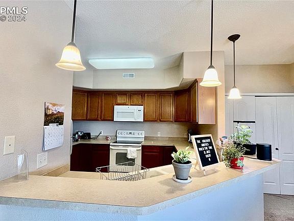 Lovely first level Condo in the beautiful Saddleback Ridge Community nestled amongst some of the most scenic areas of Colorado Springs on the west side. This two bed 2 bath has been wonderfully maintained! This move in ready condo offers an open floor plan with 9ft ceilings, gas fireplace, spacious kitchen and a private balcony to relax and enjoy the views of the bluffs in Ute valley. This home comes with newer carpet and paint through out! The Primary Bedroom has a coved ceiling, walk-in closet, and adjoining Full Bath. The living room has wonderful gas fireplace, great room concept that features sliders doors that open up to your own balcony with views of Ute Valley park! Enjoy the breakfast bar, open concept to the family room. Refrigerator, washer and dryer included. If you prefer getting out for a hike or a bike ride this condo is conveniently located near some of the most scenic trails and parks. An oversize garage is included. Don't miss the 2 storage units on your patio. If that isn't enough you also have quick access to shopping, restaurants, schools, Garden of the Gods. Do not miss this great opportunity!