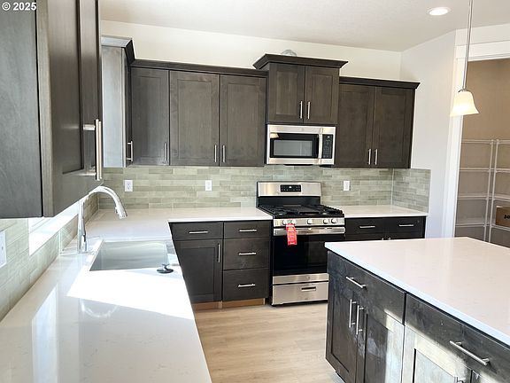 Entertainer's Dream Kitchen! 3 Bedrooms +Large Loft, Gourmet Kitchen has Quartz counter tops, stainless steel gas appliances, custom glazed tile backsplash, Island with seating, large walk-in pantry and tons of storage. Gas fireplace, lots of natural light. Light and Airy Loft for extra bonus space. Primary suite has two sinks and large walk in closet. Covered Patio and Huge yard.