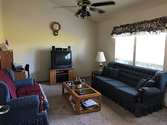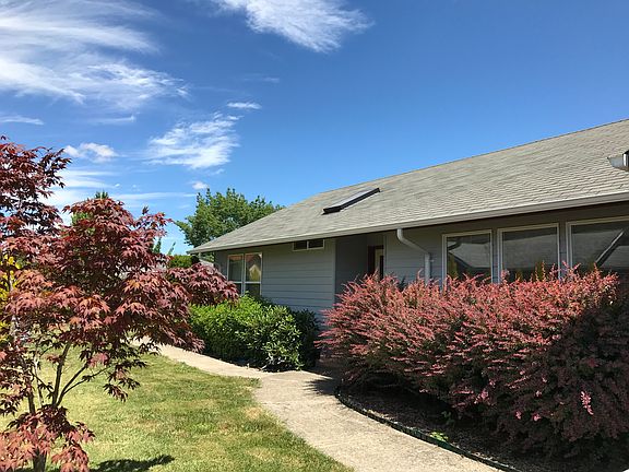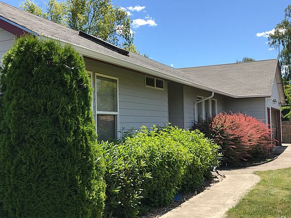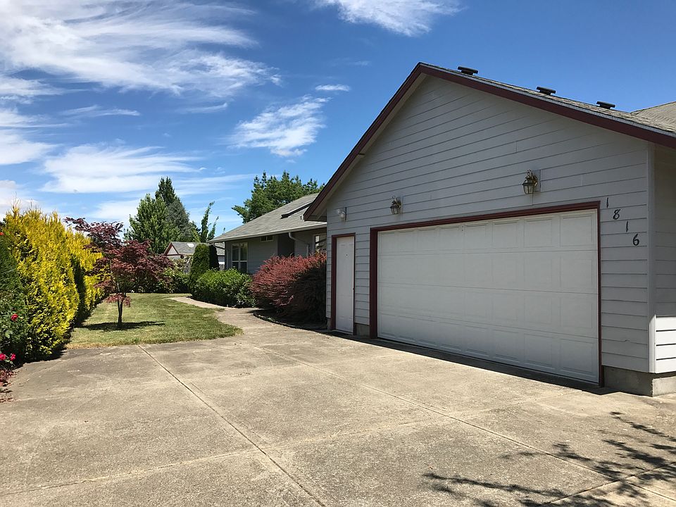 Large flag lot with extra wide driveway and RV parking. Home is 3 bedrooms and 3 full bathrooms. Third bedroom and bath are on other end of home and could be used for guest area or mother-in-law suite. Vaulted ceilings in living room, lots of windows for natural light. Kitchen features eating bar with adjacent dining area with door to back patio. Large yard nicely landscaped. Lots of privacy on this large in town lot.