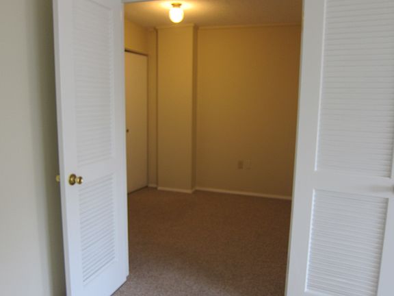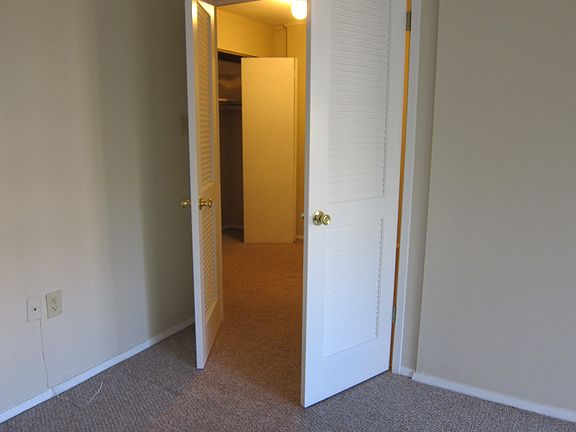 Lovely louvered doors with brass handles enclose bedroom area, providing privacy.
