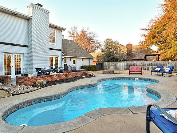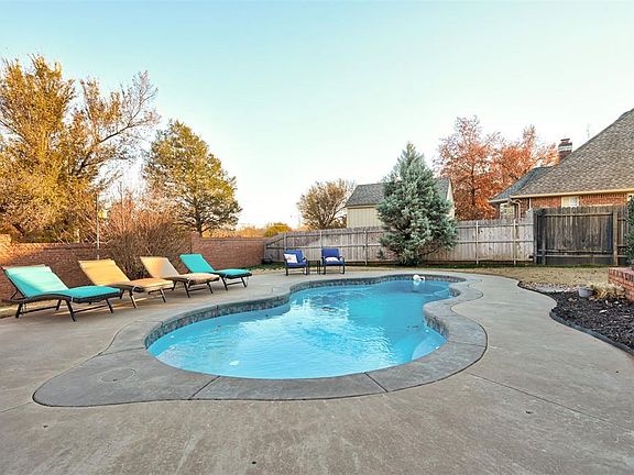 No cookie-cutter home here! In 2019, this home underwent a transformative makeover with repainted interiors, addition of ceiling fans in every room, new carpeting on the stairs, upgraded wood floors in the office, and installation of a brand-new roof. The enhancements continued in 2020 with a fresh coat of paint on the exterior, installation of a partial new fence, full yard sprinkler system, replacement of both furnaces and water heaters, new pool pump, and new stainless steel dishwasher and double ovens. This charming abode is equipped with a smart home setup on the lower level, complete with Google Nest thermostats and a security alarm system. The living room, bathed in natural sunlight, showcases double French doors, gas-burning fireplace, wood floors, and provides a picturesque view of the pool. Adjacent to the living room is a versatile space with double French doors and wood flooring, suitable for use as a dining room, office, or playroom.The kitchen is a chef's delight, boasting granite countertops and island, electric stove, double ovens, tiled backsplash, dishwasher, new disposal, and a fresh kitchen faucet. The master suite, located on the ground floor, stands out with plantation shutters and a master bath featuring a walk-in shower, standalone bathtub, double vanities, and double closets. Venture upstairs to discover three bedrooms, a jack-n-jill bathroom, and upgraded carpeting on the landing and one bedroom. One of the bedrooms features an attached room, perfect for an office or playroom. Stepping outside, a half bath off the kitchen ensures easy access to the pool. The backyard is made for entertaining. It features a beautiful pool, landscaping, additional patio space, and a 6' sundeck. The charming Olde Towne neighborhood offers a park, fishing ponds, mature trees, and scenic walking trails. Edmond Public Schools, proximity to dining and shopping, and the overall appeal makes this house a must-see; you're sure to be captivated.