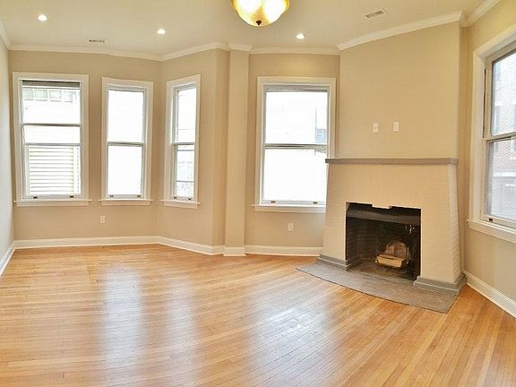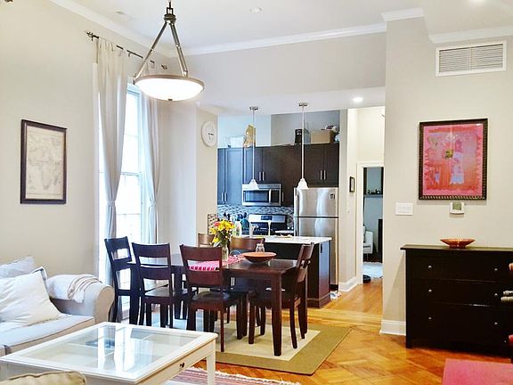 Completely gutted & renovated. Large Two bedroom w/ two new carrera marble baths. New open designer kitchen with eating bar, with granite counter tops , stainless steel appliances and custom cabinetry. beautiful hardwood floors, high ceilings, original moldings. Non-working fireplace. d/w, g/d, w/d in unit. Central heat/air. Master bedroom with bath ensuite. Good closets. Good light!
