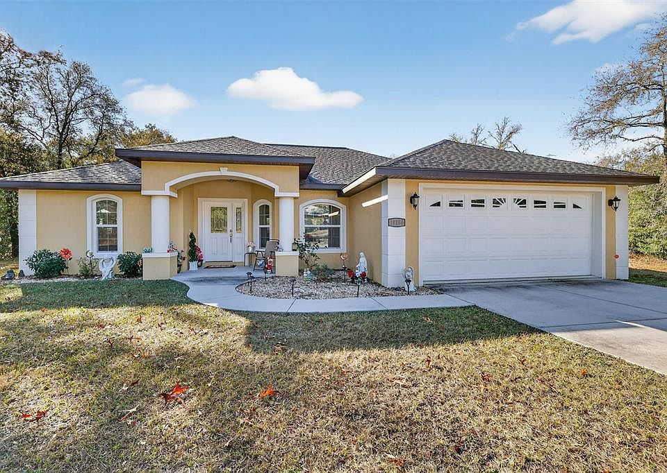 Welcome to this beautifully designed ALMOST NEW 3-bedroom, 2-bath home offering an open floor plan and a peaceful country setting on 1.05 acres. Each bedroom features elegant tray ceilings, adding architectural charm throughout. The spacious kitchen is the heart of the home, complete with a granite island and a stunning picture window that frames tranquil outdoor views—perfect for enjoying the surrounding nature. The primary suite is a true retreat, featuring tray ceiling and sliders that open to the lanai, a large walk-in closet. The ensuite bath has a spacious master shower, and a double vanity. Triple sliders extend from the master bedroom to the extended lanai, creating seamless indoor-outdoor living. Additional highlights include inside laundry with a laundry tub, stackable washer and dryer, and a pantry for added storage. Both guest bedrooms have tray ceilings as well. Enjoy the convenience of a pedestrian door in the garage, a water softener, and an extended lanai ideal for relaxing or entertaining. Located with easy access to Ocala and Dunnellon, this home offers the perfect blend of comfort, functionality, and serene country living. This property comes with private access to Rainbow River for Rainbow Springs home owners There is also a clubhouse, pool and tennis courts!