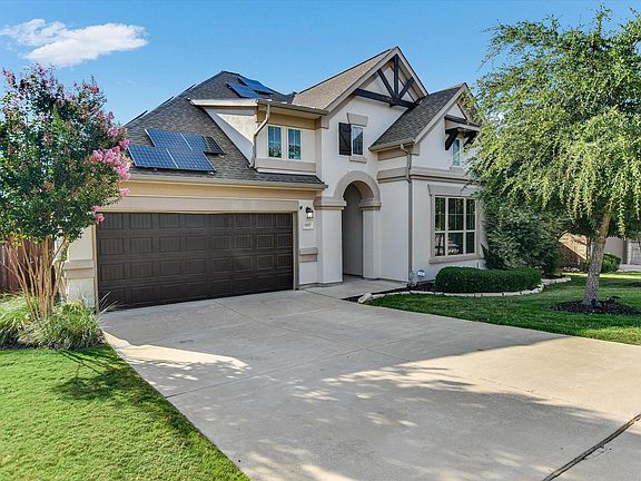 **ASK FOR DETAILS ABOUT UTILITY COST** If you're worried about energy efficiency, solar panels and a Tesla solar battery system will offset those Texas summer days' electricity bills. Old World elegance meets modern charm in this gorgeous single-story home in the highly desirable Oaks at San Gabriel community. A stucco exterior with wood accents and lush landscaping brings to mind a countryside cottage. Step inside and the cottage falls away into a modern open floor plan with ample space for your lifestyle needs. Entertaining is a breeze with a Gourmet Kitchen open to the Family Room and Dining. Granite countertops, stainless steel appliances, and a generously sized island provide prep and serving space. Arched niches flank a central fireplace anchoring the Family Room in warmth. For smaller gatherings or a quiet night in, step back into Old World elegance and your own private pub-style bar, including a cozy fireplace to warm your soul. A planning nook with a built-in desk off of the Gourmet Kitchen is perfect for managing the household or as a dedicated homework spot. The flex space is yours to imagine—work from home, play from home, or create an unconventional guest space. When you're ready to retreat to your Primary Suite, vaulted ceilings, engineered hardwood flooring, and a spa-like bath await. Wash away cares in the corner soaking tub or walk-in shower with built-in seating, or take advantage of separate vanities to avoid fighting over space in the mornings. Two secondary bedrooms with a convenient Jack-and-Jill bathroom serving both bedrooms round out your indoor living space. Step outside onto your deck and your outdoor oasis awaits. In addition to the deck, a firepit next to the gazebo is ready for nighttime cocktails or s'mores. An open lawn for your two- and four-legged family members and trees that will mature into shade for those Texas summer days complete your outdoor living space.