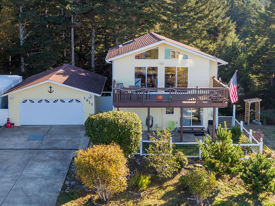 This ocean view updated cozy home with charm has 2 extra lots included in the price. 1st floor family room has a seperate entrance to the backyard w/ pellet stove. Living room has vaulted ceilings with 2nd pellet stove and access to ocean view deck. Open kitchen with beautiful granite and dining room has bay windows. The walls are insulated in the garage. Huge area for garden on So. side of home.