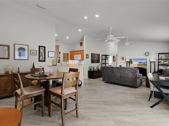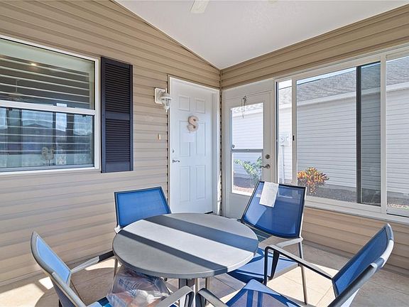 Located in a prime spot between Lake Sumter Landing and Brownwood Square, this charming Cabot Cove patio villa is a must-see! Immaculately maintained and full of natural light, this home offers comfort and convenience. Updates include a brand new roof (2023) a new hot water tank (2023), Pella sliding patio door with mini blinds, new A/C capacitor (2023), and a new garage door motor with remotes (2022). It also features a NOVA whole-house water filtration system, carbon monoxide/smoke detectors, garbage disposal, SECO whole-house surge protector, and a kitchen water osmosis filtration system. The home has beautiful ceramic tile flooring laid on the diagonal, plantation shutters, vaulted ceilings throughout, under-cabinet lighting in the kitchen, custom closets and pantry, ample storage space, a Murphy bed, built-in desk, and recessed lighting. The garage is equipped with built-in Gladiator cabinets, a garage door screen, and pull-down attic stairs for extra convenience and storage. The enclosed lanai has ceramic tile, and there are gutters, downspouts, and easy-to-care-for landscaping all around! This home truly stands out—priced to sell and ready for you to move in. The Villages has over 3,000 clubs, 107 Recreation Centers, 259 pickleball courts, 792 golf holes, 8 dog parks, 100 pools (all available to residents) and dozens of restaurants and stores. There is nightly entertainment at each square and this property is ideally located for easy access to all squares. Some furniture remains with the home - please see attachments. Schedule your private showing today!
