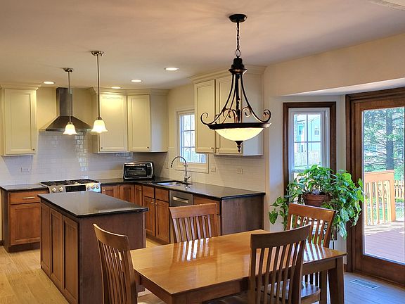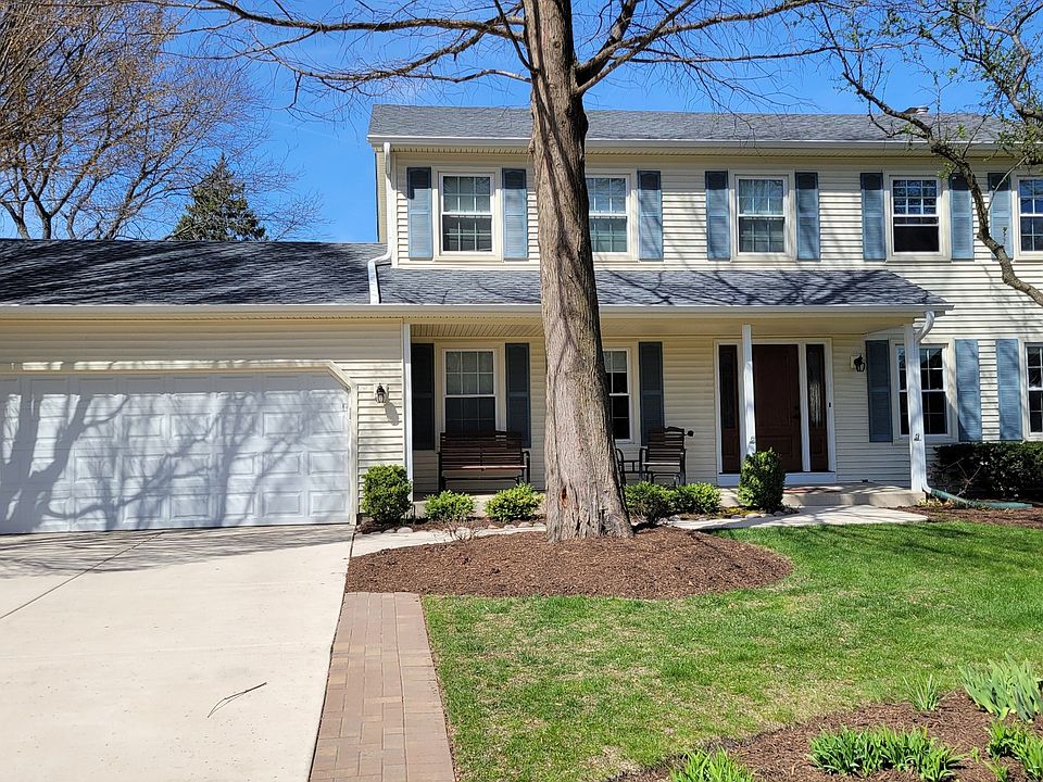 Gorgeous updated two story home located on culdesac lot with fenced rear yard. Welcoming large front porch with newer front entry door. Updated eat-in kitchen has center island, 42 inch custom soft close white upper cabinets, some lower cabinets have roll-out shelves, quartz counter tops, stainless steel appliances which include 5 burner Bosch stove and dishwasher, large walk-in pantry, and recessed lighting. Spacious family room has floor to ceiling fireplace with raised hearth, gas logs, gas starter, hardwood floors, ceiling fan and opens to kitchen. Entertainment size living room. Dining room has been converted to office with built-in bookshelves and hardwood floors for those working from home. Luxury primary suite with double door entry, walk-in closet with closet organizer, luxury updated bath has walk-in shower with Grohe multi head shower, double vanity has granite counter top, and upgrade tile floor. Updated hall bath services two additional spacious bedrooms with walk-in closets. Finished basement with recreation room, 4th bedroom, second office, plus update full bath. Newer roof and gutters with Leafguard 2024, newer furnace 2022, 50 gallon water heater 2020, new garage door opener 2025, sump pump with battery back up 2021. Enjoy the convenience of being close to schools, library, shopping, and parks.