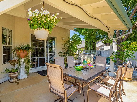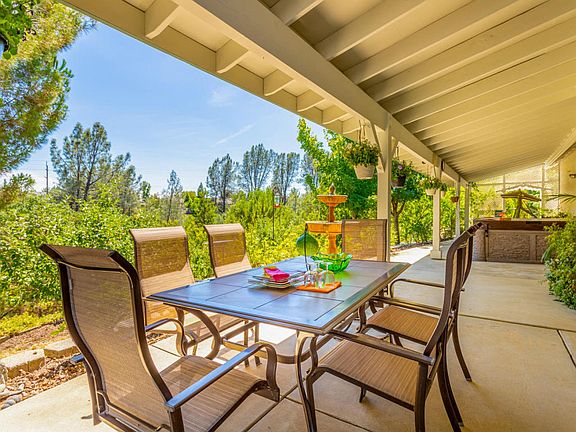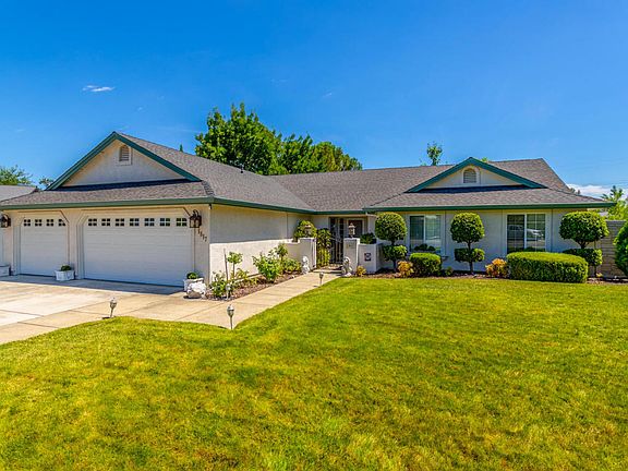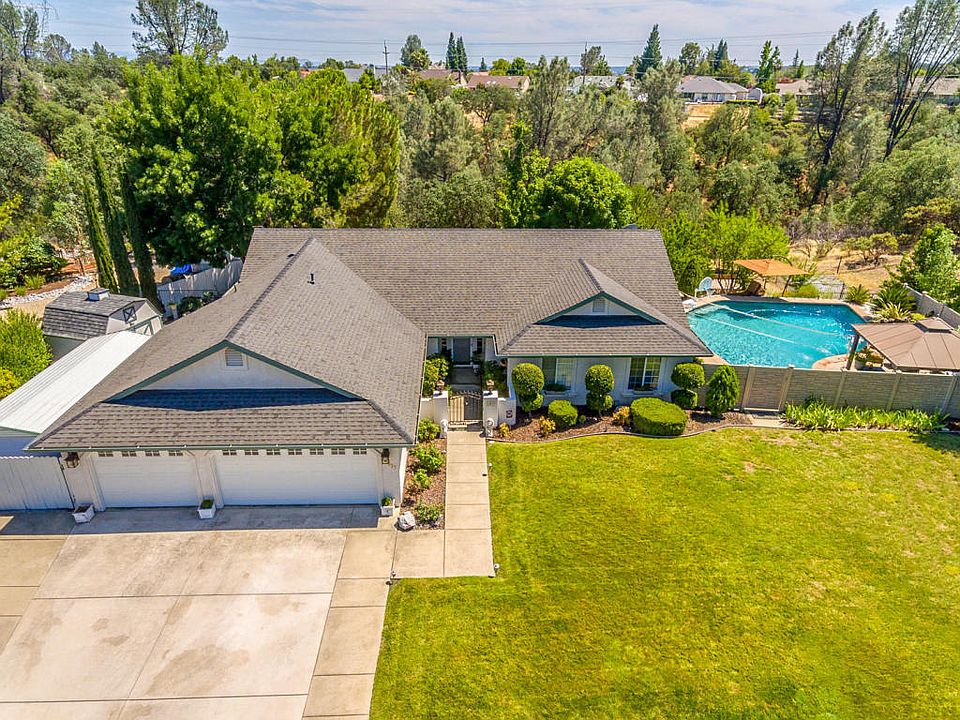 An Al Shipman-built 4 bedroom, 2 bath home located on a quiet cul-de-sac on a scenic and private .98 acres, only minutes from downtown. Built in 1995, this 1828 sq. ft. home includes a 3 1/2 car garage, a gated detached car port, and garden shed with a private patio. This property also has a large heated pool with a lovely multi-level waterfall feature, and a cabana-covered outdoor kitchen. The pool area is enclosed with a simulated stacked rock privacy fence and wrought iron fencing. The rear of the house has a full length covered patio with hot tub/spa. Savor the summer fruits from the terraced orchard, including apples, peaches, nectarines, apricots, plums, cherries and almonds. Below are raised garden beds, a shaded Bocce ball court, and ample space for the pets to run in the fenced yard. The great room and master bedroom have vaulted ceilings, and there are ceiling fans throughout. The great room also has a gas fireplace and a built-in large screen entertainment center with bookshelves. The recently upgraded open kitchen features quartz countertops and new stainless gas range and hood. Enjoy the natural light from the large bay window, and views of your own private green space, with mature evergreens and oaks.
