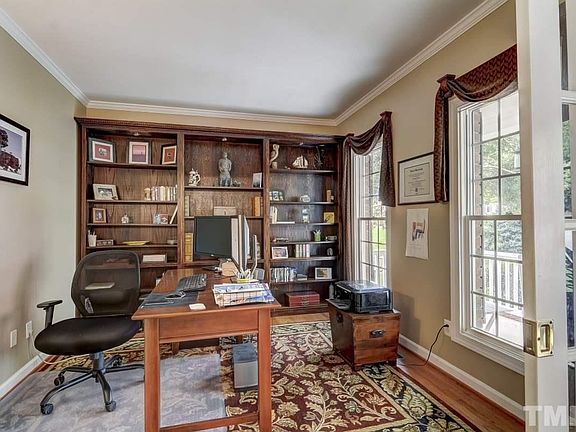 Fantastic 5 bedroom 3 full bath home in prime N Raleigh location. Hardwoods throughout 1st floor. Huge formal dining rm w/ bay window & trey ceiling. 1st floor office w/ bookcases. 2 story family room includes gas log fireplace. Bright & open kitchen offers center island, granite tops, s/s appliances (gas cooktop/double oven) & tile b-splash. 1st floor guest suite. Master suite has sitting rm, garden tub w/ separate shower + 2 WIC's. Spacious bonus rm. Oversized deck. Backyard has wonderful wooded buffer.