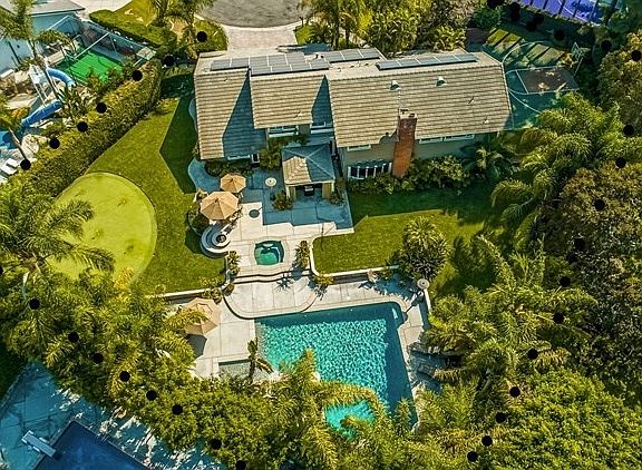 Gorgeous entertaining home on cul de sac with 4 bedrooms and 5 baths. Perfect home that allows you to expand into many areas inside and flexibility to work/play at home. All while enjoying this expansive backyard paradise with your own beach entry rock pool/ slide, spa, outdoor Bar B-Q island, putting green, grassy areas, and a separate wide side yard with a sports court. Several patio seating areas to sit back and relax while you entertain or spend time with friends & family. Surround sound both inside and outside. Besides outdoor Bar B-Q, the gourmet kitchen can boost culinary art with custom, convenient features such as Wolf 4 burner with griddle range & hood, double stainless ovens, marble island with utility sink & bar seating, built-in expresso coffee & beverage bar, sub-zero refrigerator and warming drawer. Custom cabinets with soft close drawers, farmhouse sink, pot filler and a separate butler's pantry add to the kitchen luxuries. First floor also includes an office, 1.5 baths, family room, dining room, billiards room and a large family room that opens to the kitchen and backyard. The bedroom's upstairs includes: Jack & Jill bedroom & bath, secondary full bath and a luxurious master bedroom suite. MBR features include high ceilings, wardrobe with built-ins & cedar lined walk-in, wide planked oak floors. Bath has honed marble floors, full length soft close linen closet, double sinks on quartz counters and marble shower. View Matterport for more.