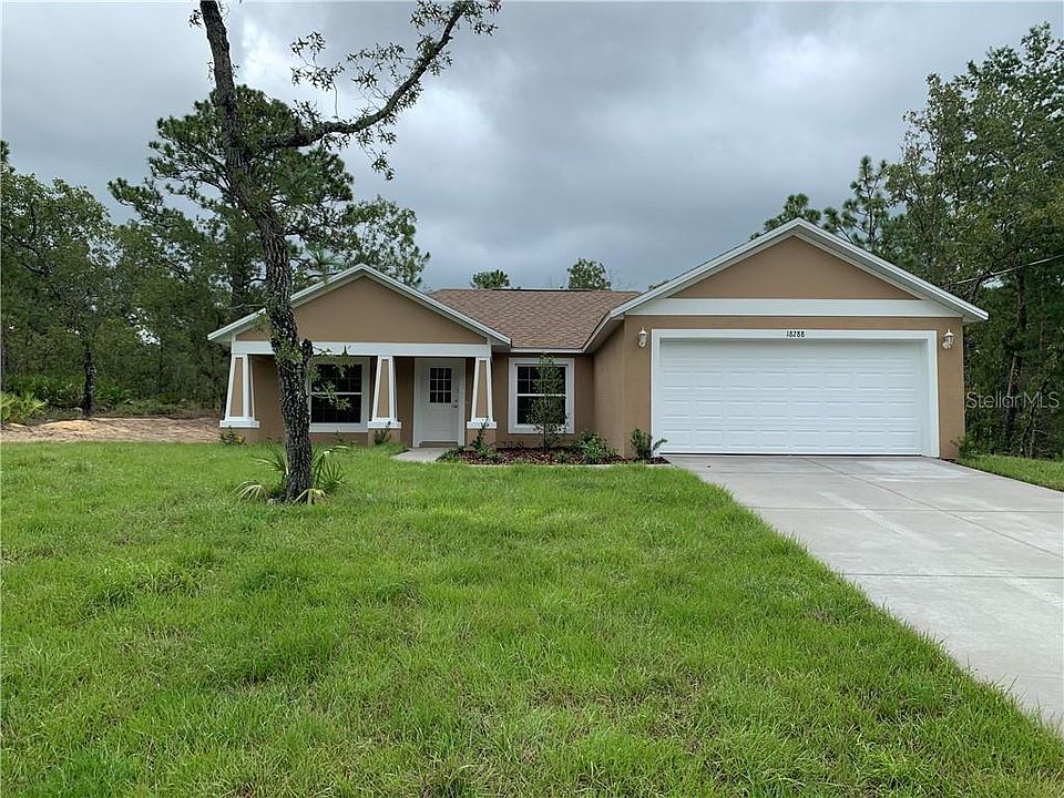 Under Construction. Under Construction. NO HOAs NO CDDs. New three bedroom two bathroom two car garage home sitting on .46 acre. The open floor plan of this home from the great room to kitchen to dining room allows for an easy flow when entertaining. Open the sliding glass doors in the dining room and bring the outside in or step out onto the patio and take in a deep breathe and know you are home. Kitchen shows off stainless steel appliances which include dishwasher, microwave, range and double stainless steel sink. The island in the kitchen has drawers and cabinet space. Flooring in great room, kitchen, and dining room will be laminate with carpet in the bedrooms and tile in bathrooms. Master bedroom offers a spacious walk-in closet. Master bath has a tiled walk-in shower and a dual sink vanity. Guest bathroom has a shower/tub combination. Home has Rainbird Sprinkler System and a garage door opener. Home has septic and well. Home will not be on lot shown in photo. Photos shown are of a prior Tradesman model. Taxes shown are for the land only