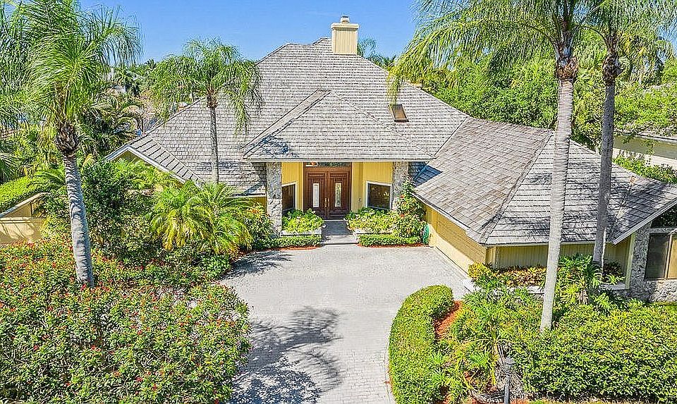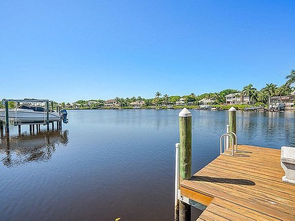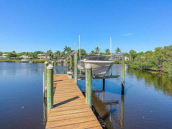 Breathtaking, wide river views of this highly desired pool home on elevated lot in the exclusive gated community of River Ridge! Meticulously maintained, single-story 3 bedrooms, plus an office with closet (can be utilized as bedroom) 2.1 bath, 2 car garage has an open split floor plan and vaulted ceilings. It features tile throughout, wood plank flooring, 2 coral mantel fireplace, built-in bar, oversized covered patio & all fenced backyard. Sweeping water views from all living areas, pool & open kitchen, pool and lanai. Long dock with 10k lb boat lift to accommodate up to 25' boat with water/electric. Enjoy the beautiful sunsets with a lushly landscaped back yard setting with open pool and stunning wide river views!