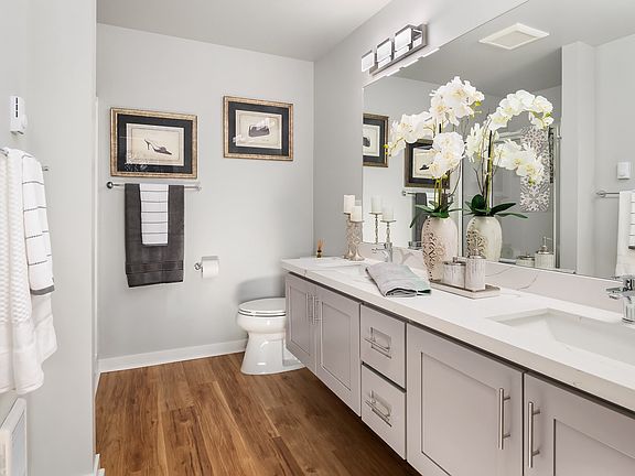 White quartz countertopsFull size kitchenTwo car garageLarge windowsIsland counter spaceWalk-in closetVinyl floors