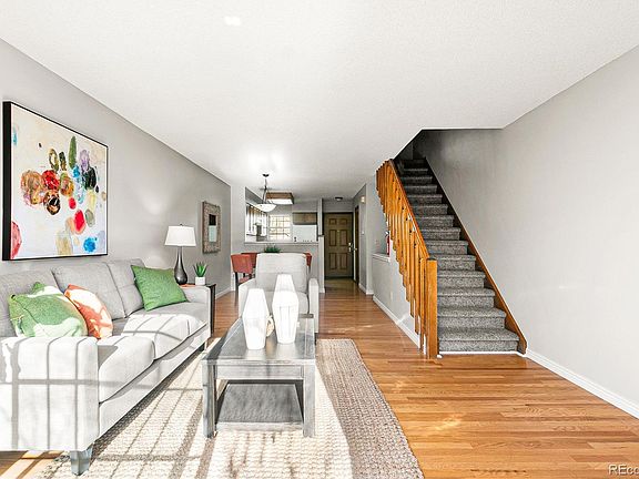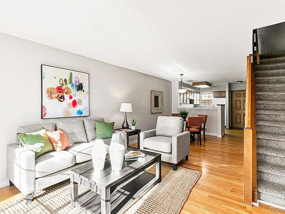 This cute and newly painted townhome sits privately nestled in the community. An abundance of natural light reflects off the gleaming hardwood floors; upstairs has brand new carpet! The kitchen opens to the living area with a fireplace, a balcony, and a nearby guest bath. Upstairs are two generously sized bedrooms, the primary has an en suite bath, and there is an additional bath off the hallway. Don't miss the finished bonus room on the lower level! It's a prime space for workouts, office, or storage. It is perfectly located to shops, parks & DTC.