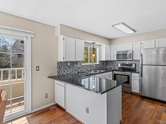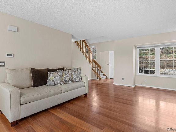 Home on the trail! Instead of a street or parking lot, the front door of this amazing townhome opens to a beautiful, tree-lined section of the popular High Line Canal Trail! Inside, a two-story skylight foyer pours into the spacious living room with wood floors and a fireplace. Open U-shaped kitchen is the perfect balance between a separate cooking area and being part of the action when entertaining. Soaring vaulted ceilings in both bedrooms enhance the airy feeling throughout. Balcony is perfect for watching the sun set over the mountains. Oversized two-car garage below. Pool and spa close by. Call Stu the listing agent to find out why the seller has priced this home to prioritize a quick sale over getting the last nickel.