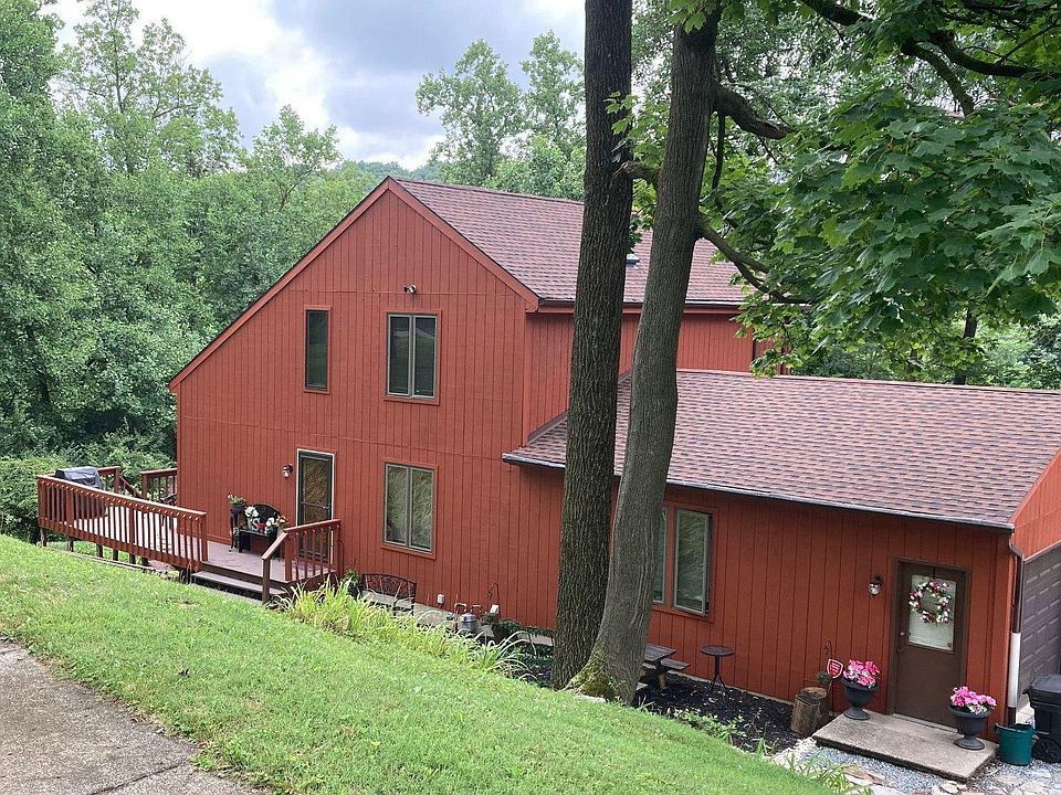 TRULY RARE: Separate living area with full bath, private entrance, private deck, full kitchen , separate A/C. 1st level bedroom and bath, upper level 3 bedrooms and bath, private nearly one acre, partial wooded, wrap around deck, large firepit area,. Total of 5 bedrooms and 3 full baths(one on each level) Fast Possession