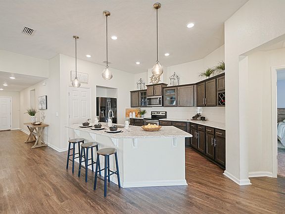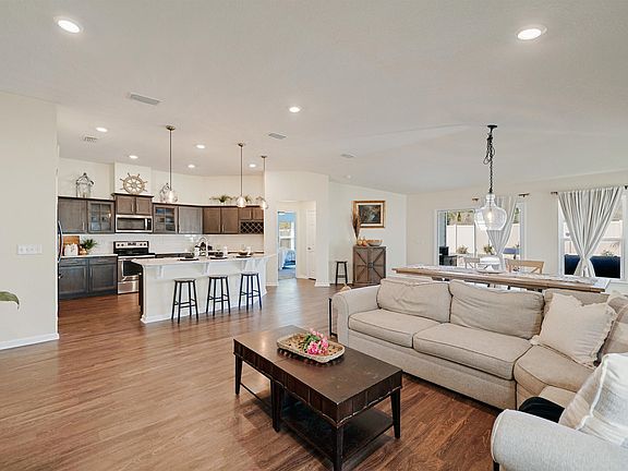 Welcome home! This 1,997 sq. ft., 4-bedroom, 2-bathroom home sits on a quiet cul-de-sac in the charming Magnolia Grove community. It offers a functional floor plan, desirable location, and the peace of mind that comes from owning a home just 7 years young! The open floor plan provides plenty of natural light. The expansive living and dining areas flow into the kitchen, which features a large island, quartz countertops, and ample cabinet space. The primary bedroom includes a walk-in closet and an en-suite bath with dual vanities and a walk-in shower. Three additional bedrooms and a second bath offer plenty of extra space for family, guests, or a home office. The fully fenced backyard features a covered lanai, paver patio, and fire pit—creating the perfect outdoor space for relaxing and entertaining. The convenient location provides easy access to shopping, dining, parks, and the beach. This home is waiting for its new owner—schedule a tour today! All information pertaining to the property is deemed reliable, but not guaranteed. Information to be verified by the Buyer. Be advised that cameras may exist recording audio and video inside/outside the property, such as ring doorbells. Photos are digitally enhanced and could be altered, please verify.